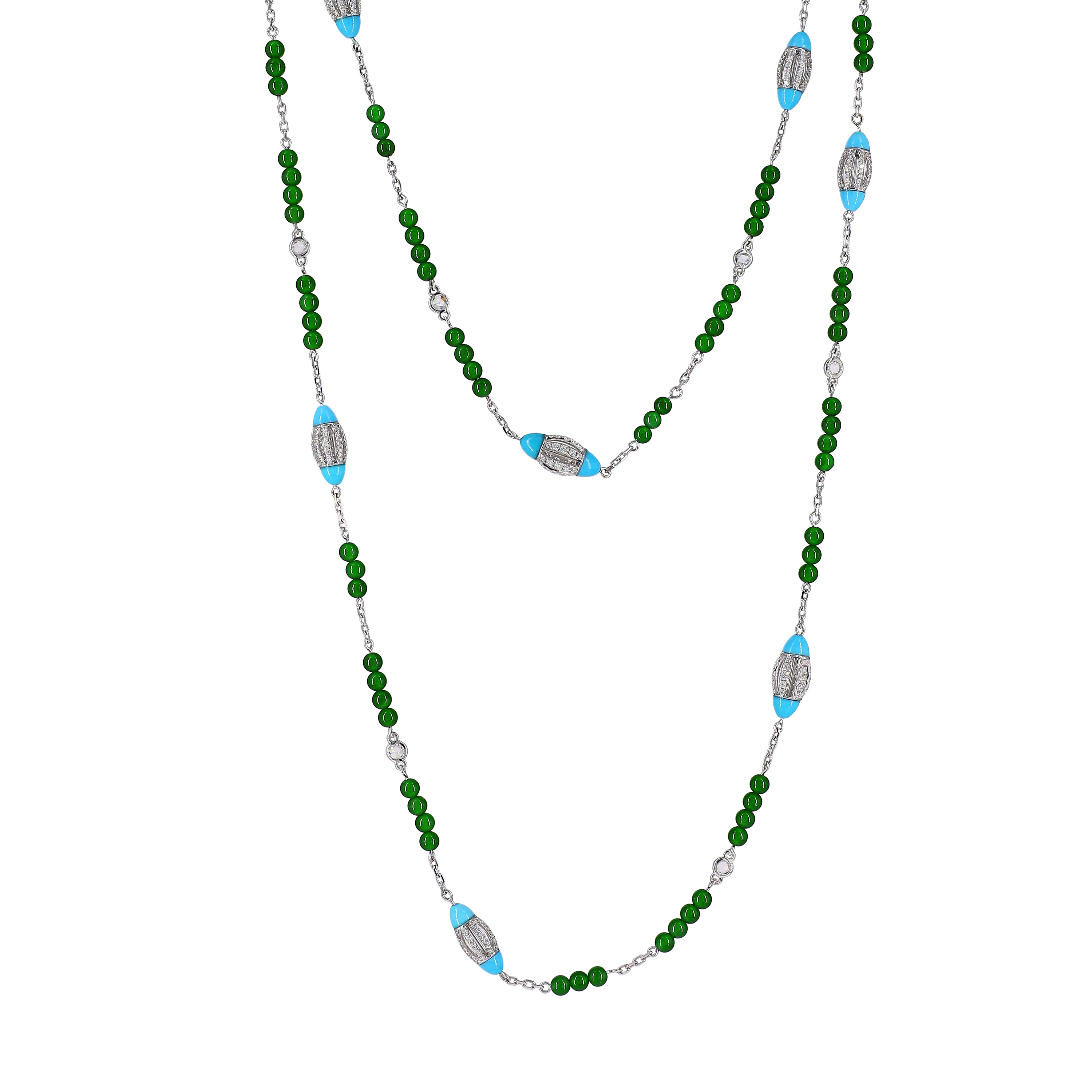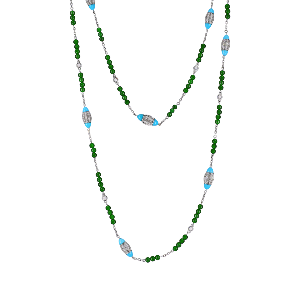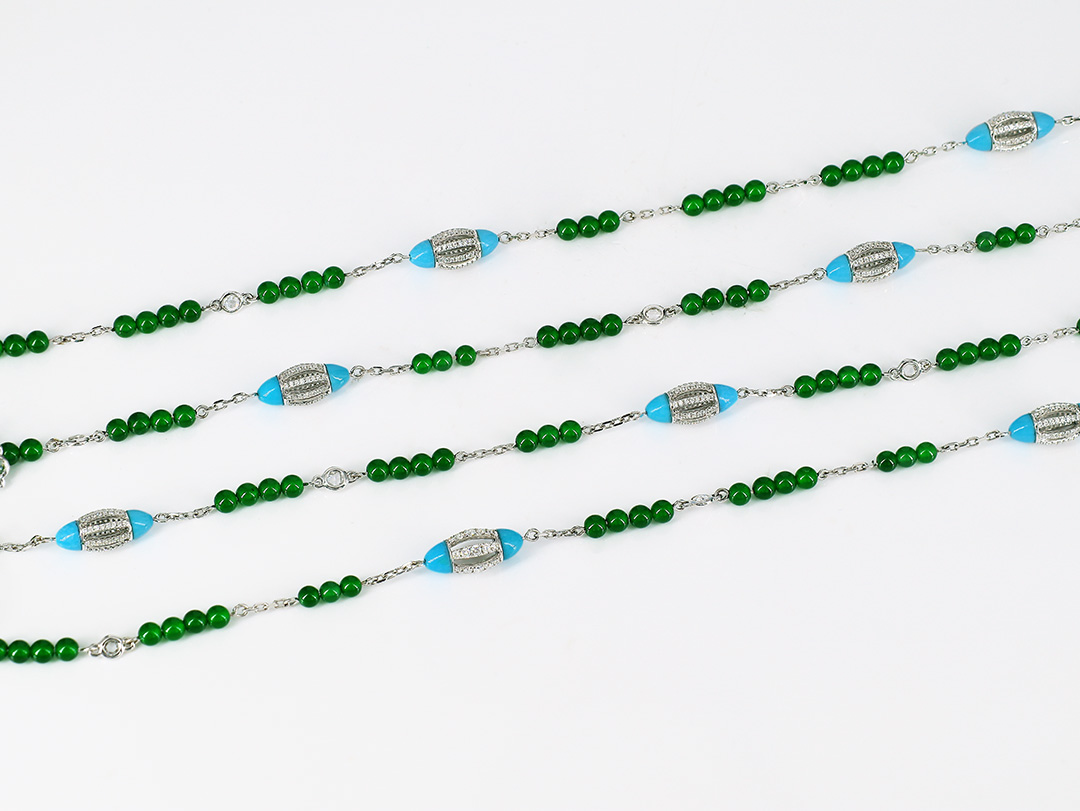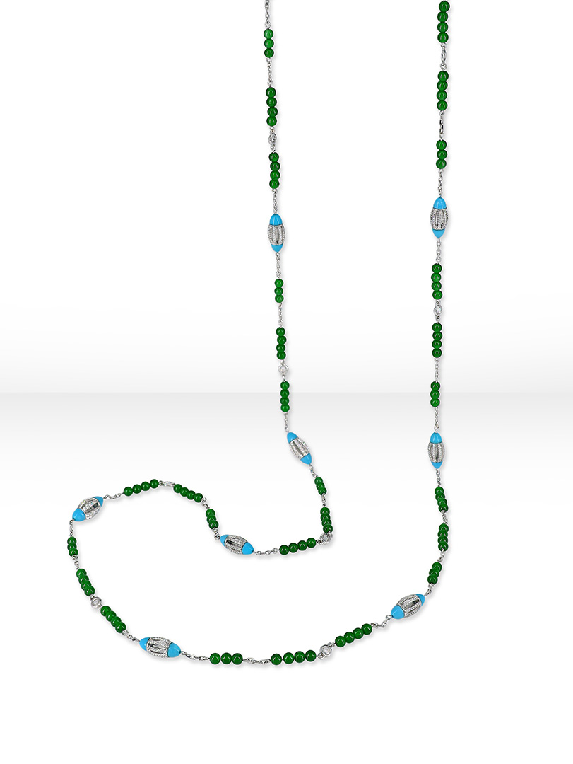 這款長項鍊結合土耳其石、玉珠和鑽石,展現出充滿張力的色彩碰撞,鮮明卻和諧,為造型注入獨特個性。