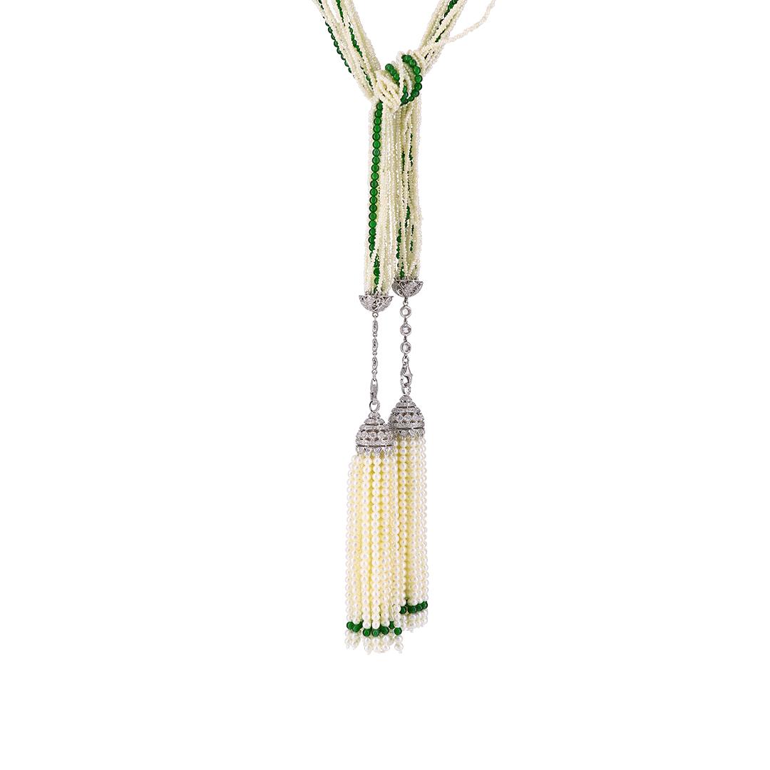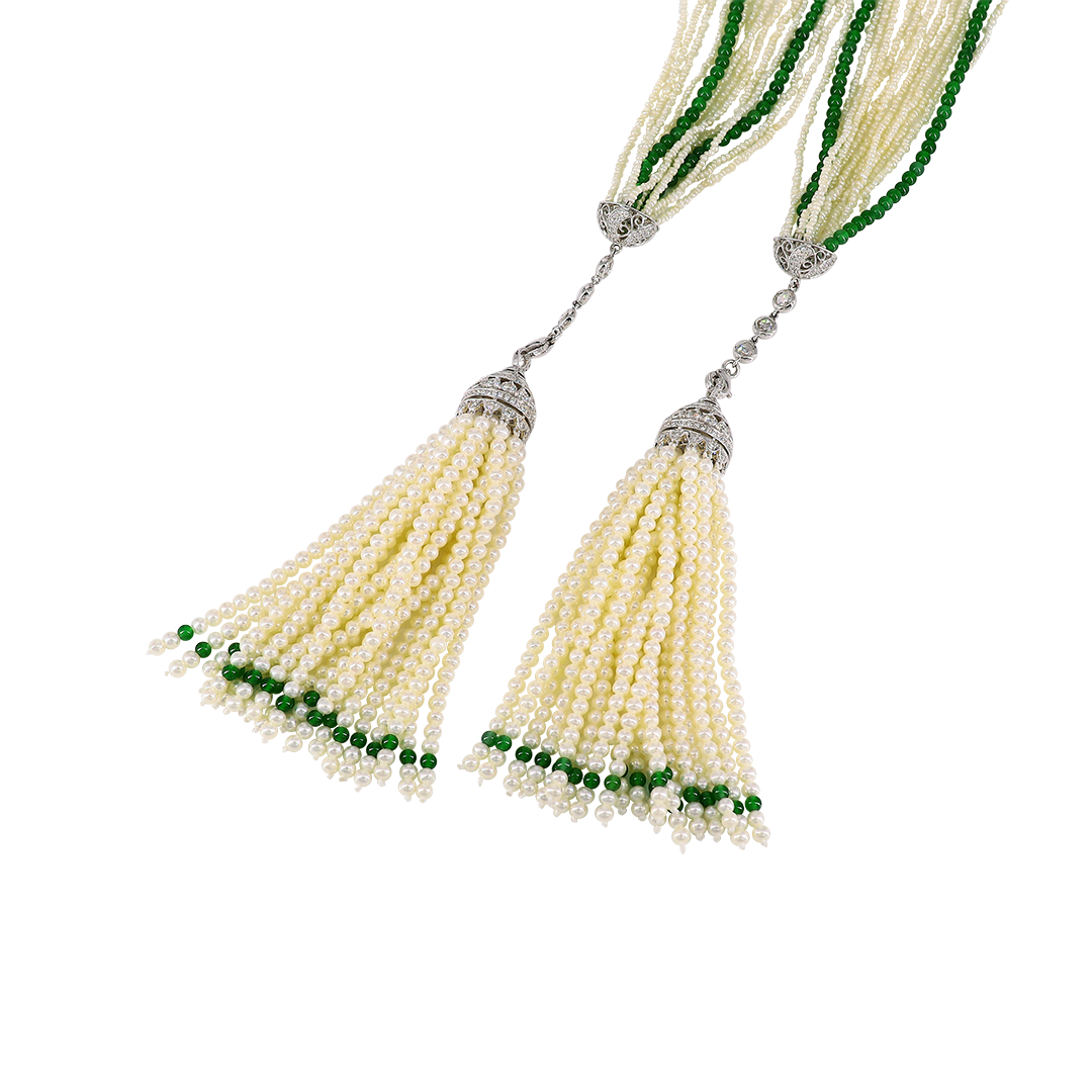 一顆顆的珍珠串成了優雅流蘇,搭配翠綠的玉珠與璀璨鑽石,彷彿春日晨光中的露珠與綠意,為整體造型增添靈動與層次。在胸前輕輕打個結,隨步伐自然擺盪,柔美而不失個性。