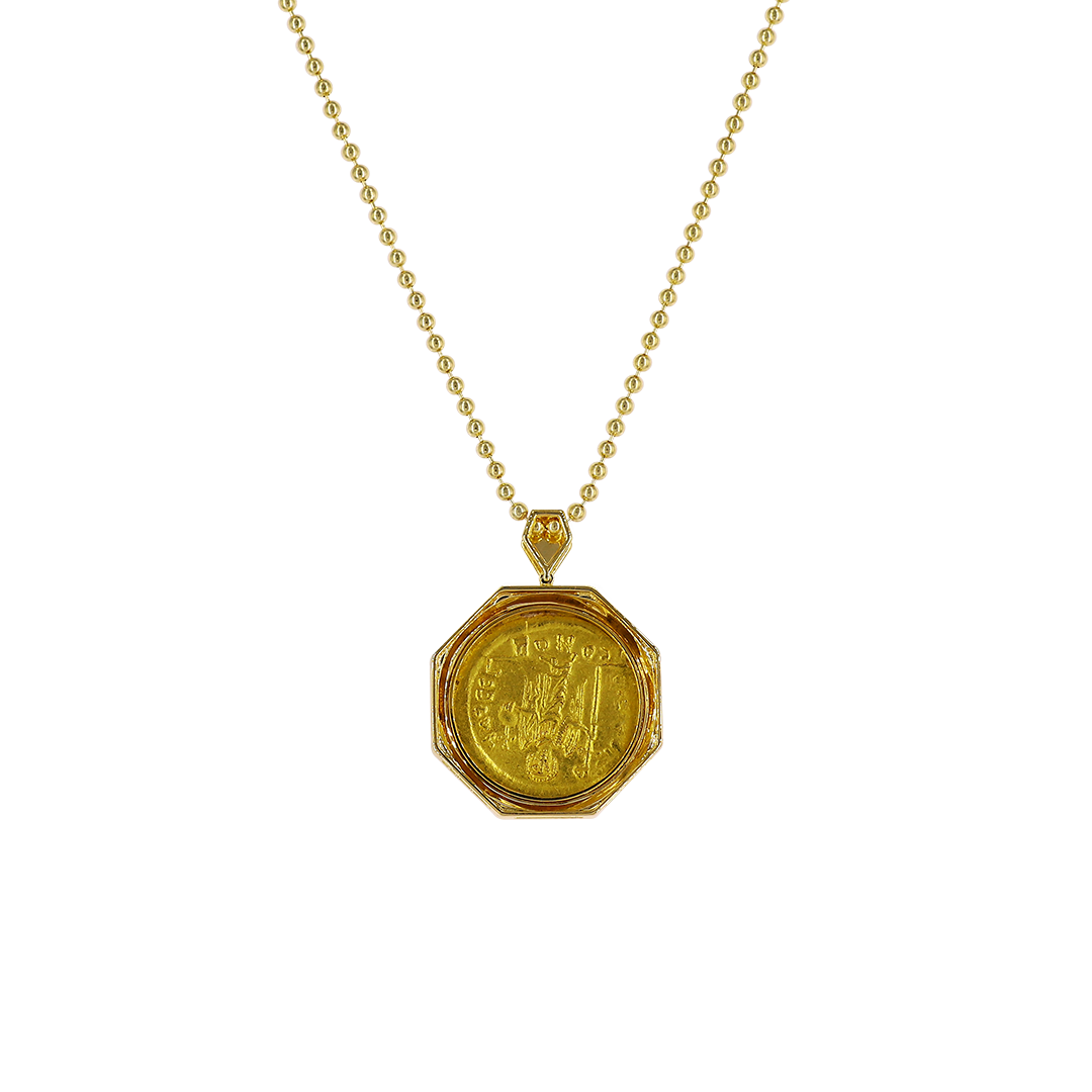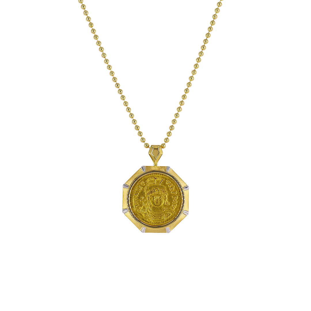 當古幣遇上現代設計,不只是時間的交會,更是一段歷史的重生。 這個古幣墜子,鑲嵌的是東羅馬帝國刻有莫里斯皇帝肖像的古錢幣——他是一位成功的軍事家,也將這段輝煌定格在這小小圓型之上。 在經歷歲月洗禮後,如今化為一種低調卻鮮明的風格象徵。 佩戴它,讓一位帝王的意志、勇氣與榮耀,與您並肩而行。